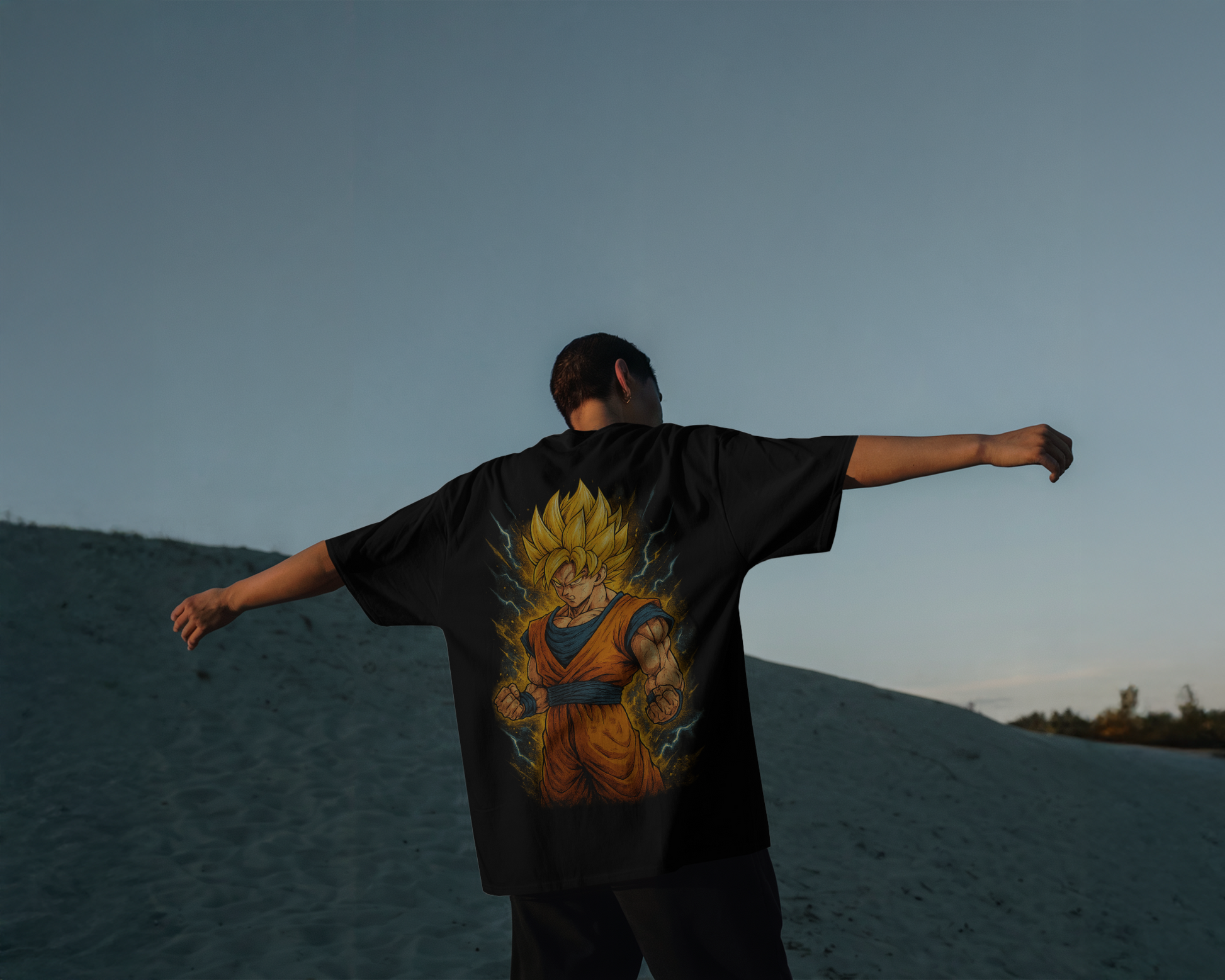 👕 Camiseta negra oversize con diseño potente inspirado en Goku Super Saiyan 2, una de sus transformaciones más icónicas en Dragon Ball Z.