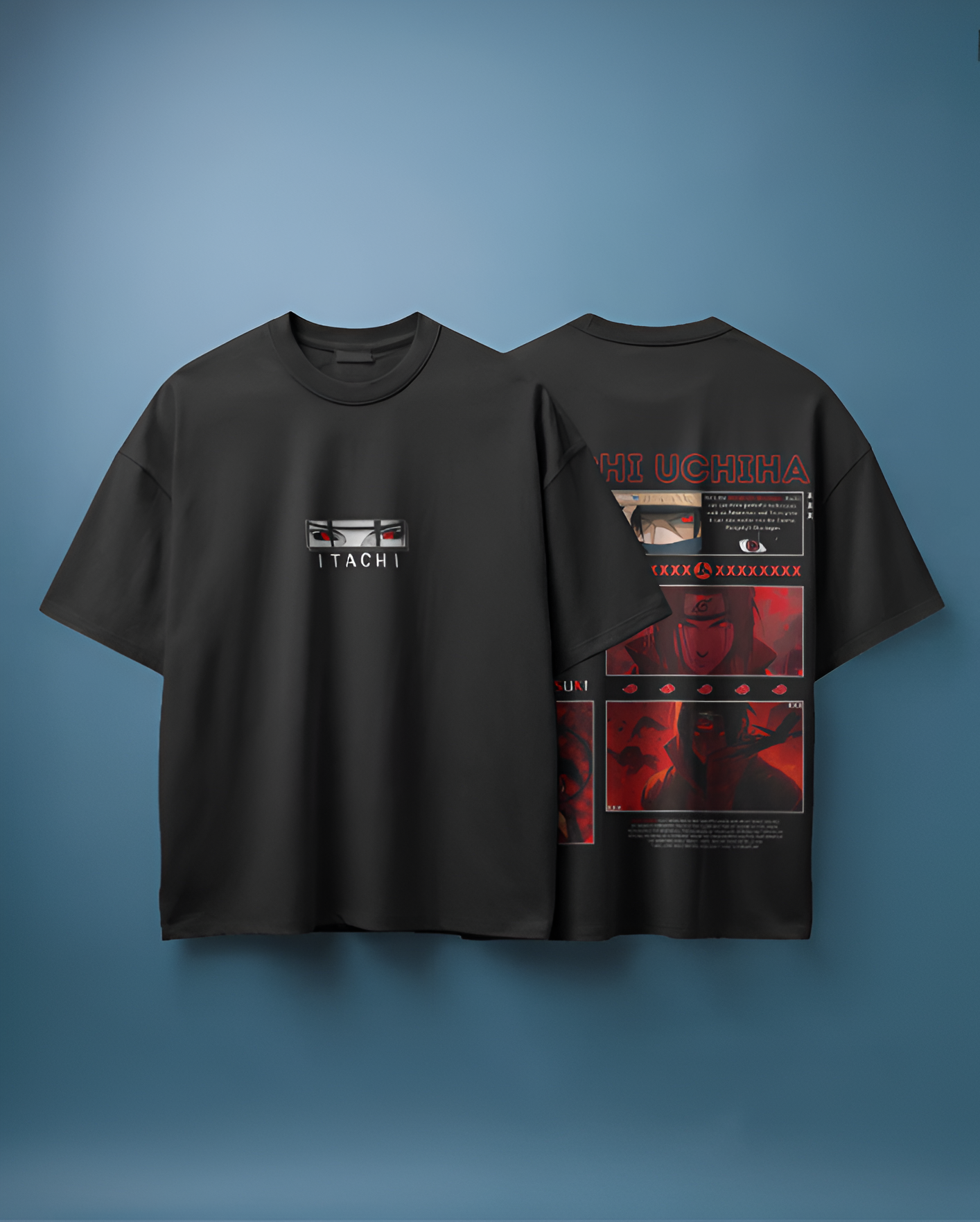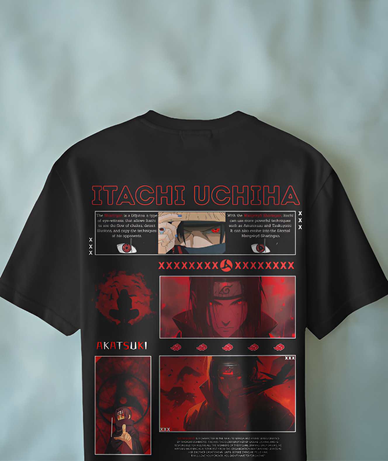 🖤Camiseta negra oversize con diseño oscuro y estético, inspirada en Itachi Uchiha , uno de los personajes más legendarios de Naruto .
