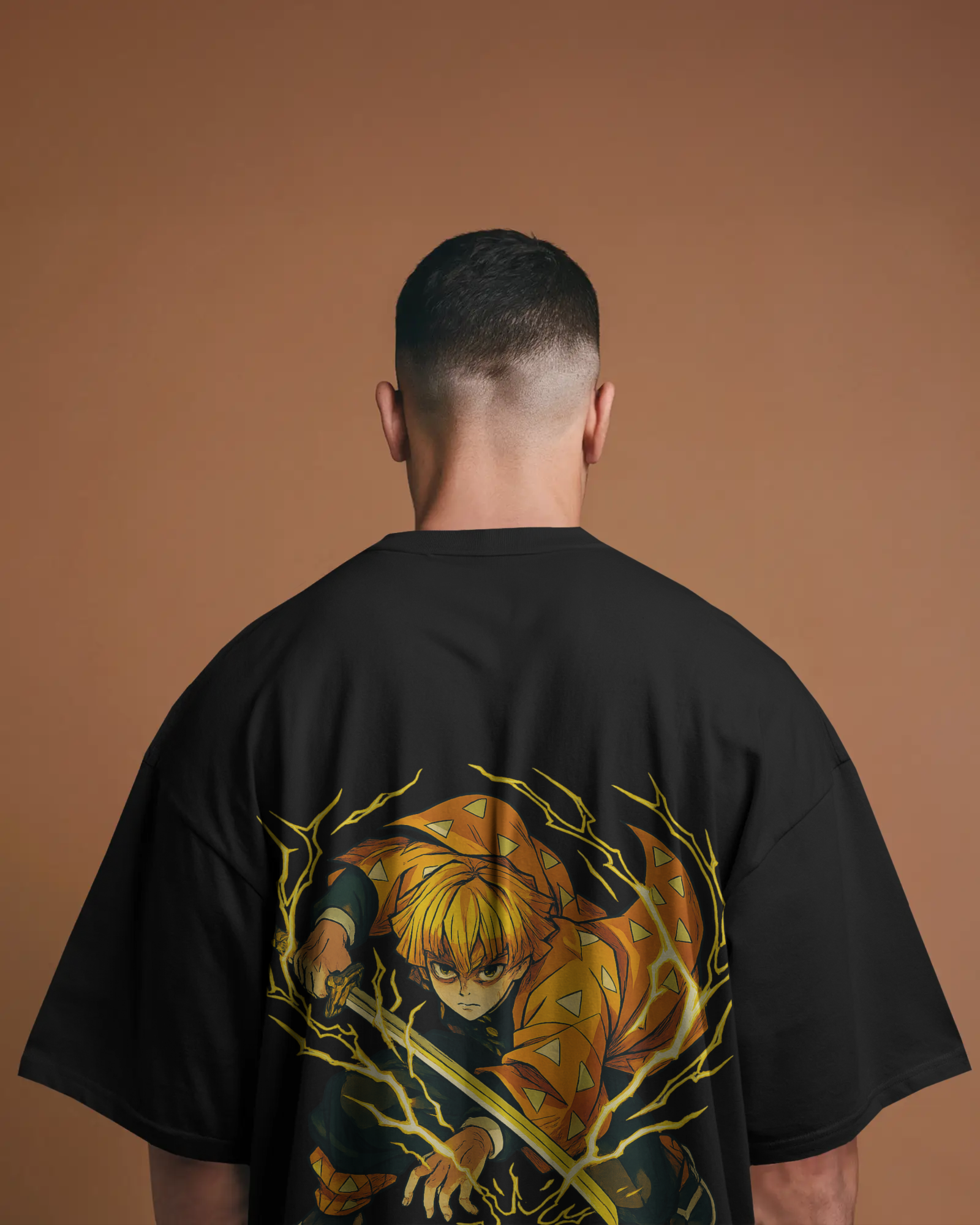 ⚡ Camiseta negra oversize con diseño exclusivo de Zenitsu Agatsuma, uno de los personajes más queridos de Demon Slayer (Kimetsu no Yaiba).